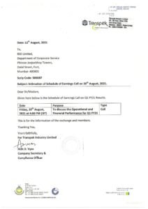 Intimation of Business Update Conference Call – August, 20210 commentsSubmit a Comment Cancel replyYou must be logged in to post a comment.