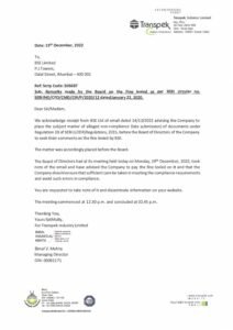 Intimation of the discussion by the Board in response to the Email by BSE0 commentsSubmit a Comment Cancel replyYou must be logged in to post a comment.