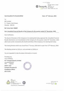 Statement of Standalone and Consolidated Unaudited Financial Results for the Quarter ended on 31st December, 2023